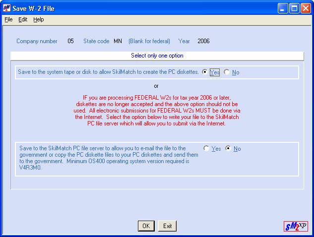 To cancel and return to main menu without processing W-2 file, click [Exit].