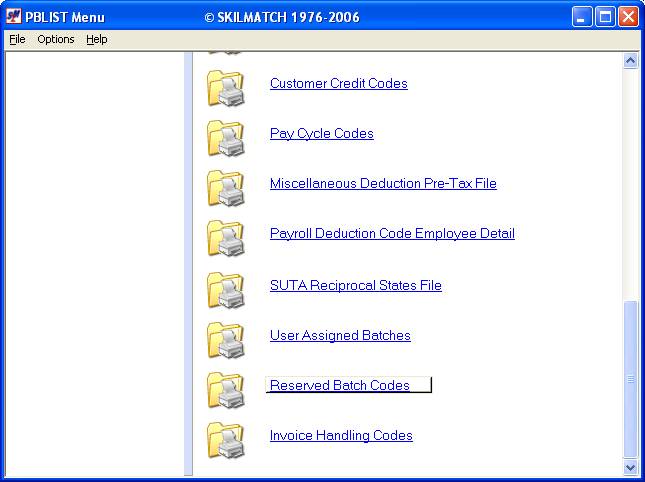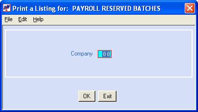 This option creates a printout (named PB576P) of the reserved Payroll Batch names. Reserved batches allow you to reserve a specific timesheet batch for a specific purpose.